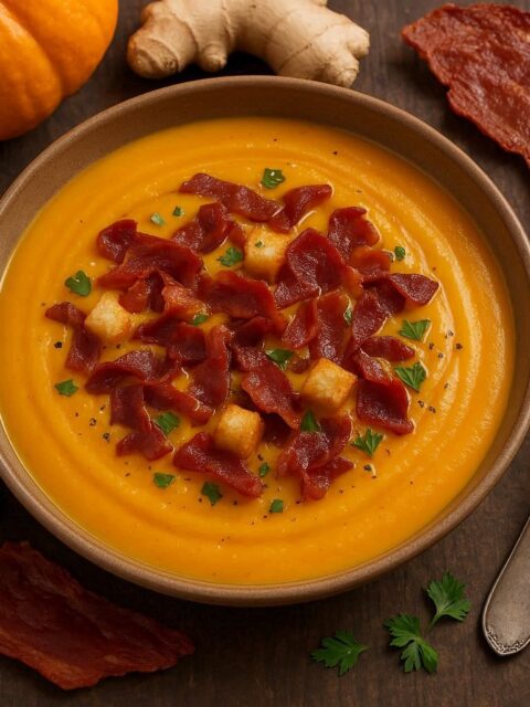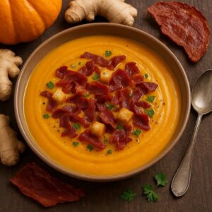 - Crema de calabaza con jengibre y crujiente de jamón