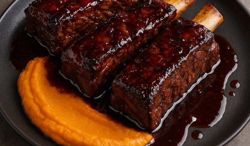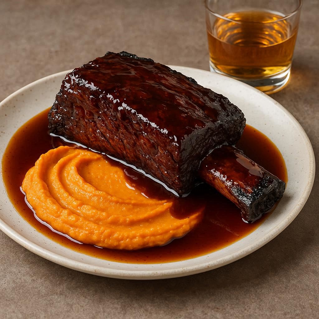 Carne de costilla melosa y deshuesable, con un glaseado ahumado-dulce que recuerda a la barbacoa moderna, y un puré suave y ligeramente dulce que equilibra todo el plato.