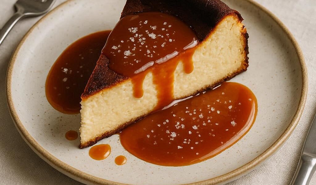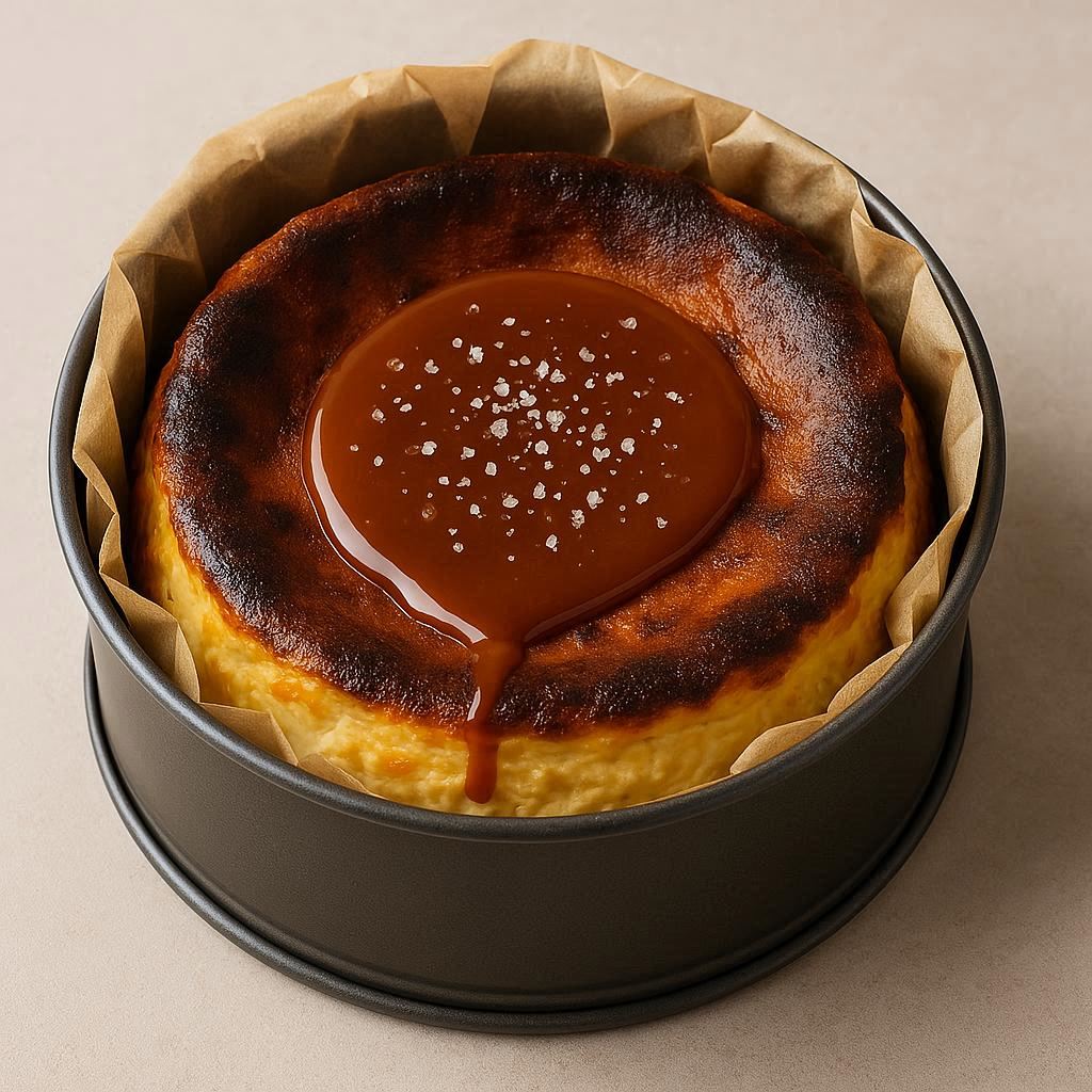 Una tarta de queso cremosa al estilo San Sebastián, coronada con caramelo salado y un toque de flor de sal que equilibra dulzura y elegancia.